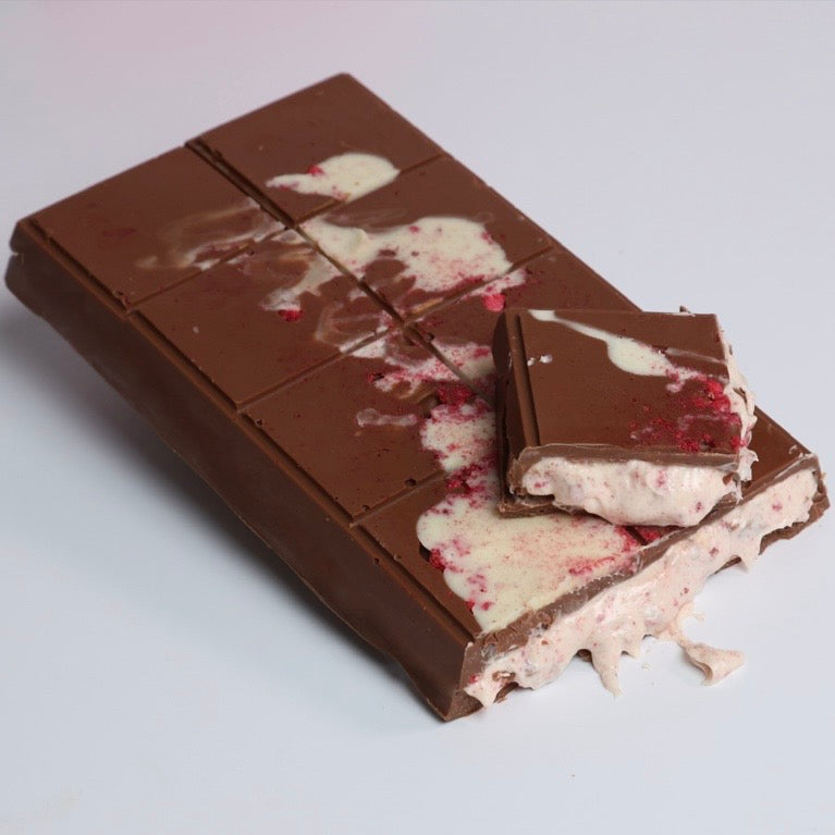 ✨🍫 Mliečna čokoláda s krémom z bielej čokolády, lyofilizovanými malinami a malinovým prachom.